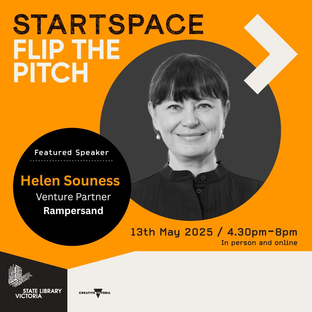 Melbourne: Rampersand Venture Partner, Helen Souness will âFlip the Pitchâ at Startspace on 13 May at the State Library Victoria (or online). Helen will join 21 other speaker,s each delivering a 3-minute pitch on how we support founders, startups and aspiring entrepreneurs across the state. Get your in-person ticket or register to attend online.